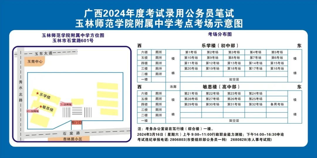 請及時登錄“廣西人事考試網(wǎng)”打印筆試準(zhǔn)考證并妥善保管,仔細(xì)查看準(zhǔn)考證上的考點(diǎn)信息。本次考試玉林考區(qū)共設(shè)10個考點(diǎn),各考點(diǎn)名稱、考點(diǎn)詳細(xì)地址如下: