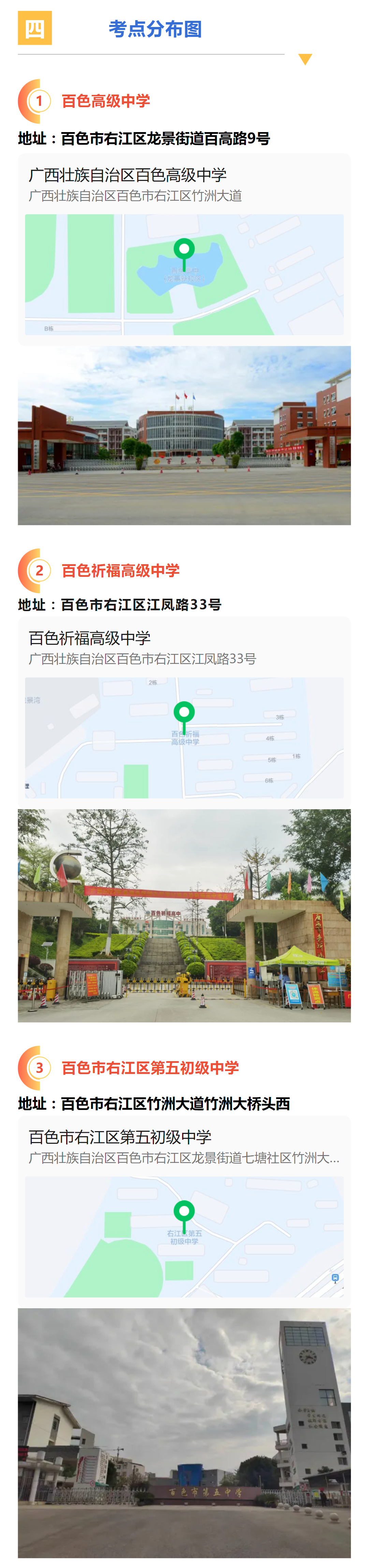 百色高級中學(xué)、百色祈福高級中學(xué)、百色市右江區(qū)第五初級中學(xué),考生具體考點以準考證上地點為準。