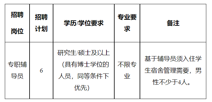 (四)年齡不超過30周歲,即1993年12月1日及之后出生;具有博士學(xué)位的,或具有高級職稱的,或有專職輔導(dǎo)員工作經(jīng)驗(yàn)且在各類輔導(dǎo)員職業(yè)能力競賽、輔導(dǎo)員評優(yōu)評先等活動中獲得過省部級(含)以上獎勵表彰者,年齡可放寬至35周歲,即1988年12月1日及之后出生。