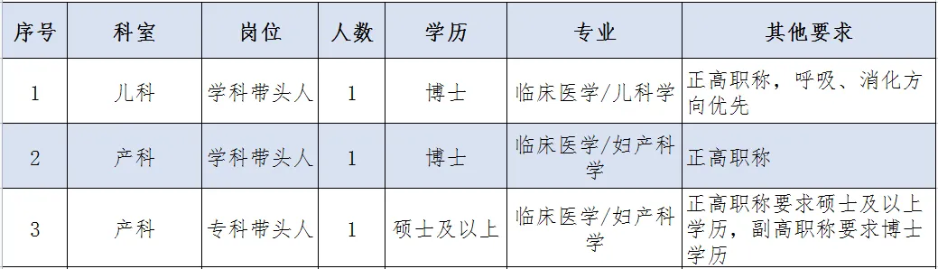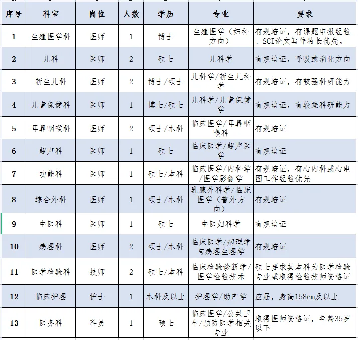 (4)其他情況,年齡要求:初級職稱不超過30歲、中級職稱不超過35歲、副高職稱不超過45歲,正高職稱不超過50歲;醫(yī)師崗位要求四證齊全,即畢業(yè)證、學位證、醫(yī)師資格證、規(guī)培證齊全。