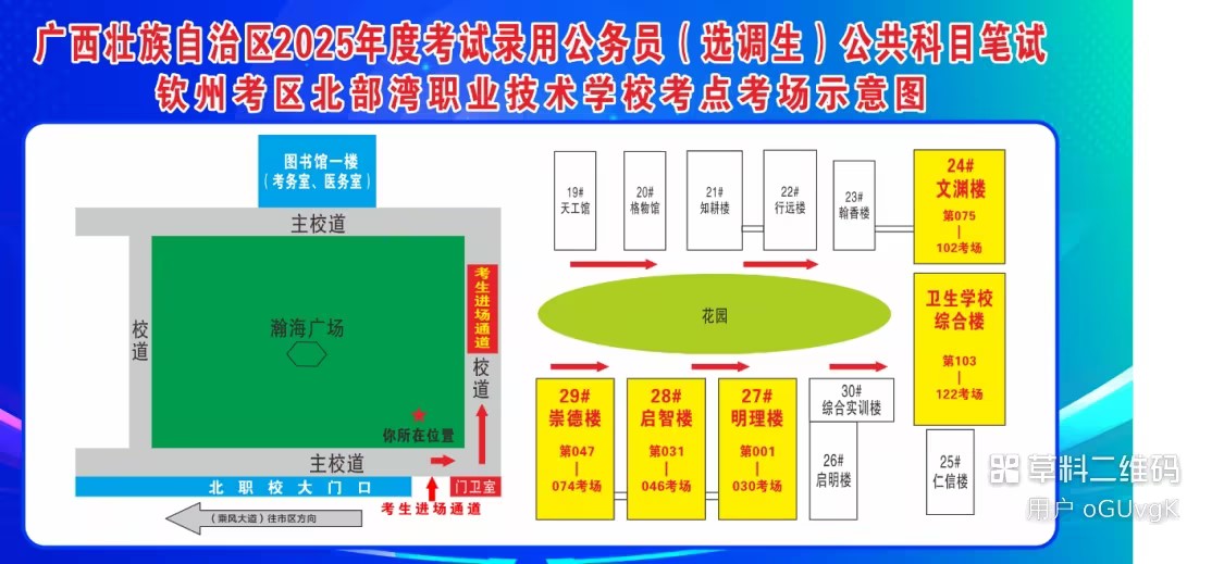 欽州考區(qū)共設(shè)兩個(gè)考點(diǎn),分別為北部灣大學(xué)考點(diǎn)、北部灣職業(yè)技術(shù)學(xué)校考點(diǎn)。(考點(diǎn)地址和具體考場安排請掃附后的二維碼查看)