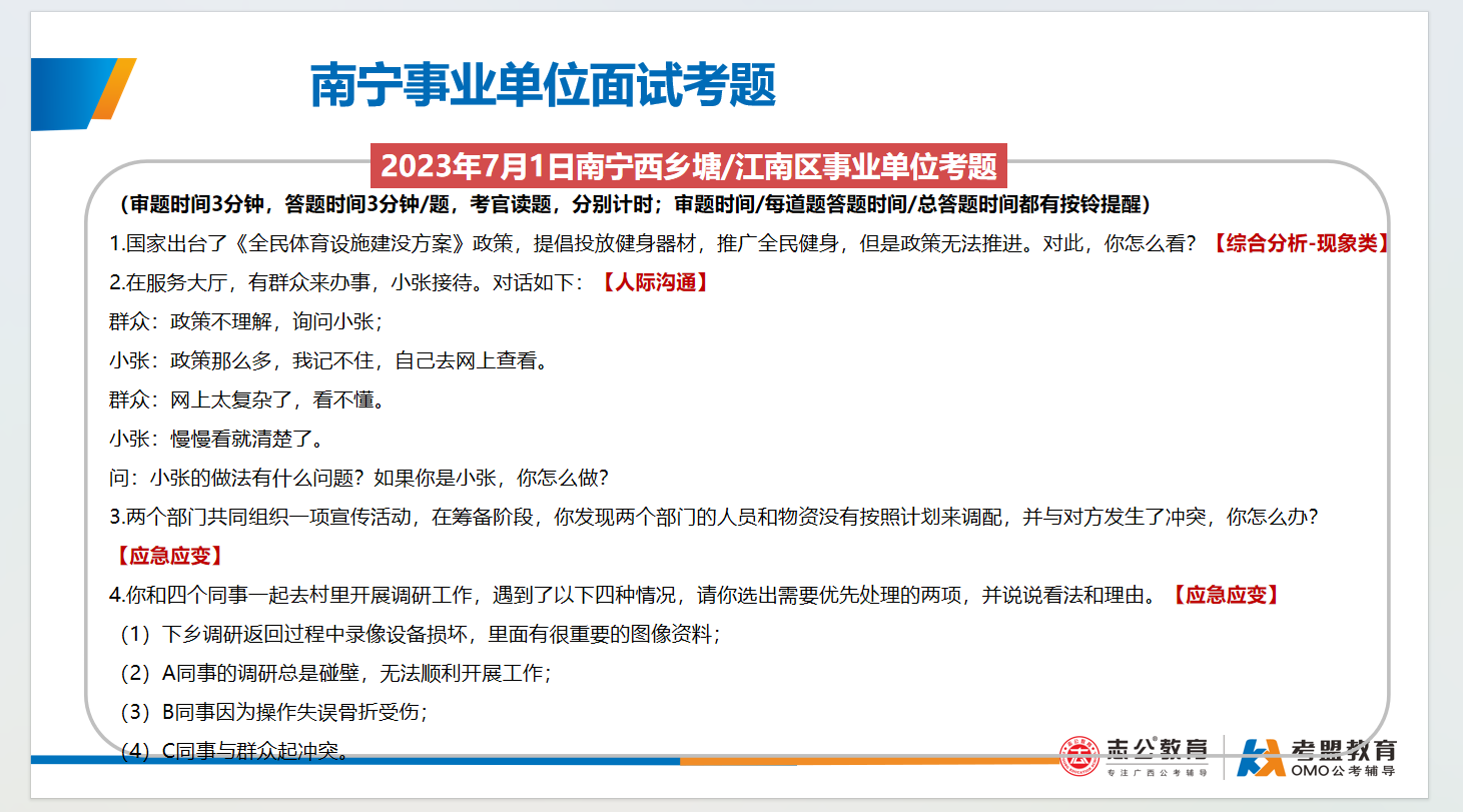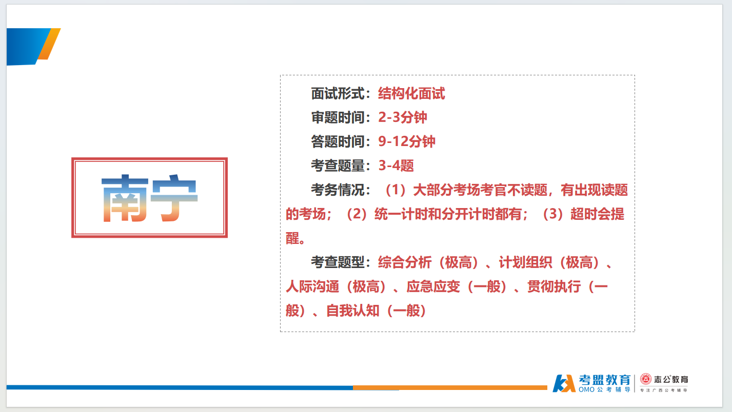 南寧事業(yè)單位面試主要采用結(jié)構(gòu)化面試形式、考查題量有3-4題,答題時間為9-12分鐘,考查題型:綜合分析(極高)、計劃組織(極高)、人際溝通(極高)、應(yīng)急應(yīng)變(一般)、貫徹執(zhí)行(一般)、自我認知(一般):