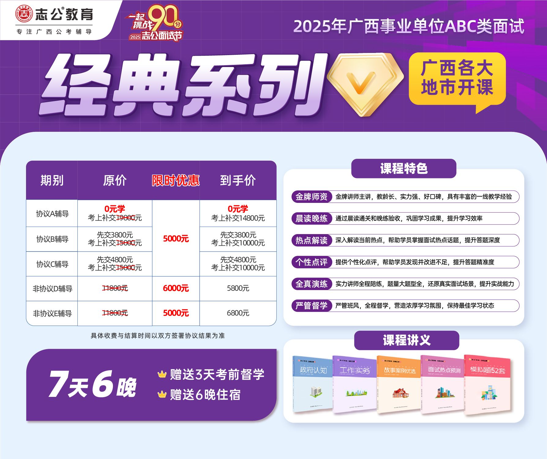 面試是事業(yè)單位招聘中的關(guān)鍵環(huán)節(jié),隨著2025年廣西事業(yè)單位大部分地市成績(jī)計(jì)算的改革,面試1分相當(dāng)于筆試的3分,所以面試至關(guān)重要,選擇一個(gè)好的培訓(xùn)課程,可以讓你在面試中脫穎而出。我們的面試培訓(xùn)課程,不僅價(jià)格優(yōu)惠,而且特色鮮明,如果你正在為廣西事業(yè)單位面試做準(zhǔn)備,不妨考慮一下我們的課程。