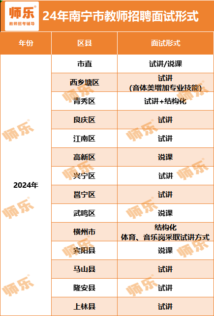 南寧市各區(qū)縣教招面試方式為:試講、說(shuō)課或試講+結(jié)構(gòu)化。