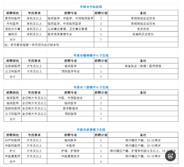 岑溪市中醫(yī)醫(yī)院2025年6月計劃招聘人才7名,岑溪市中醫(yī)醫(yī)院醫(yī)共體成員單位共計招聘人才12名。