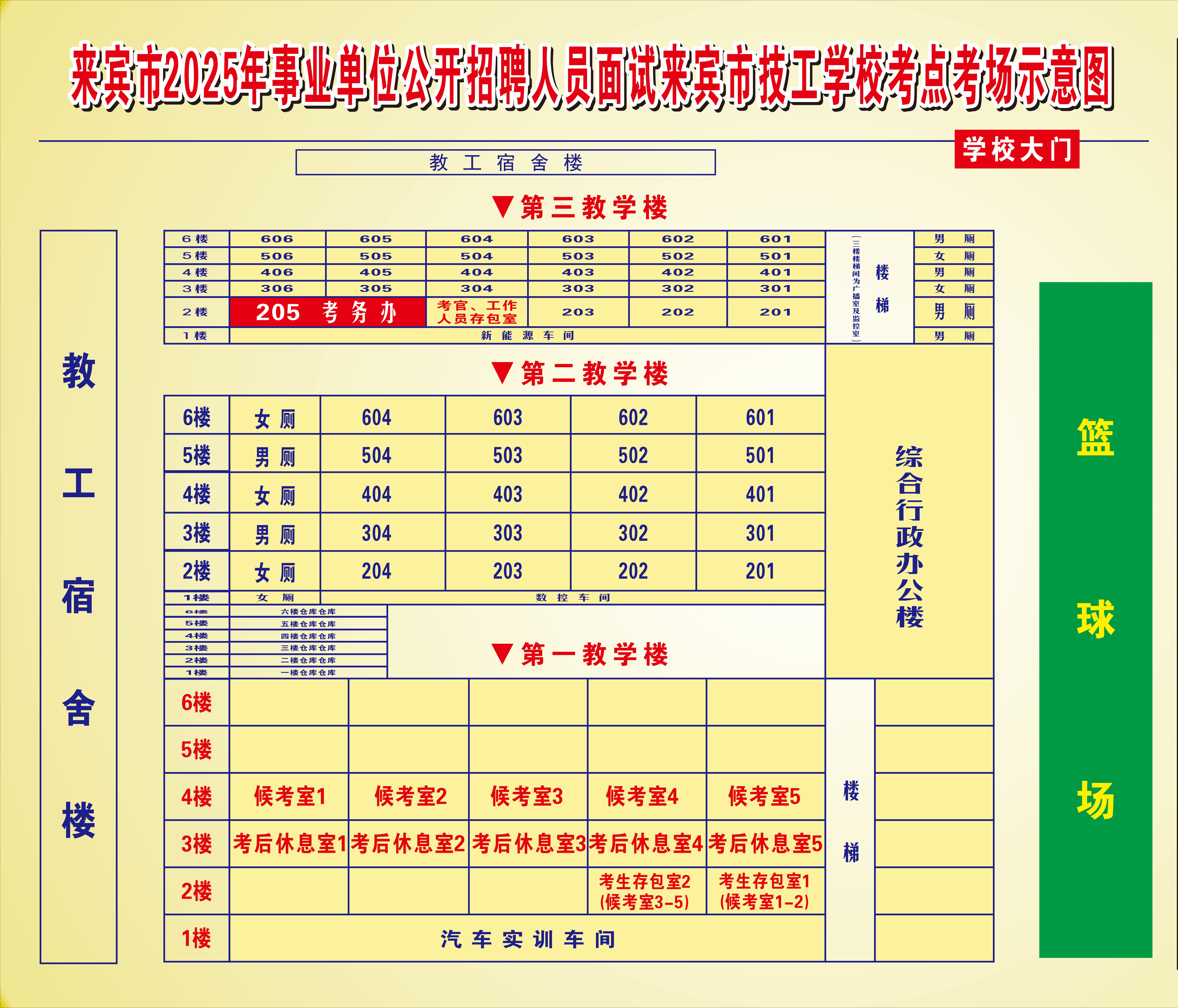 3.考生到達(dá)考點(diǎn)學(xué)校后,首先將除本人身份證、《面試通知書》外的禁止使用和攜帶的物品送到存包室存放,存包后到對(duì)應(yīng)候考室報(bào)到驗(yàn)證。候考室1、候考室2的考生到考生存包室1存包,候考室3、候考室4、候考室5的考生到考生存包室2存包。
