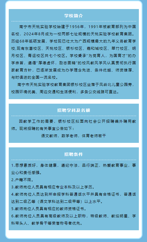 南寧市天桃實驗學校教育集團銀杉校區(qū)2025年外聘教職工招聘公告