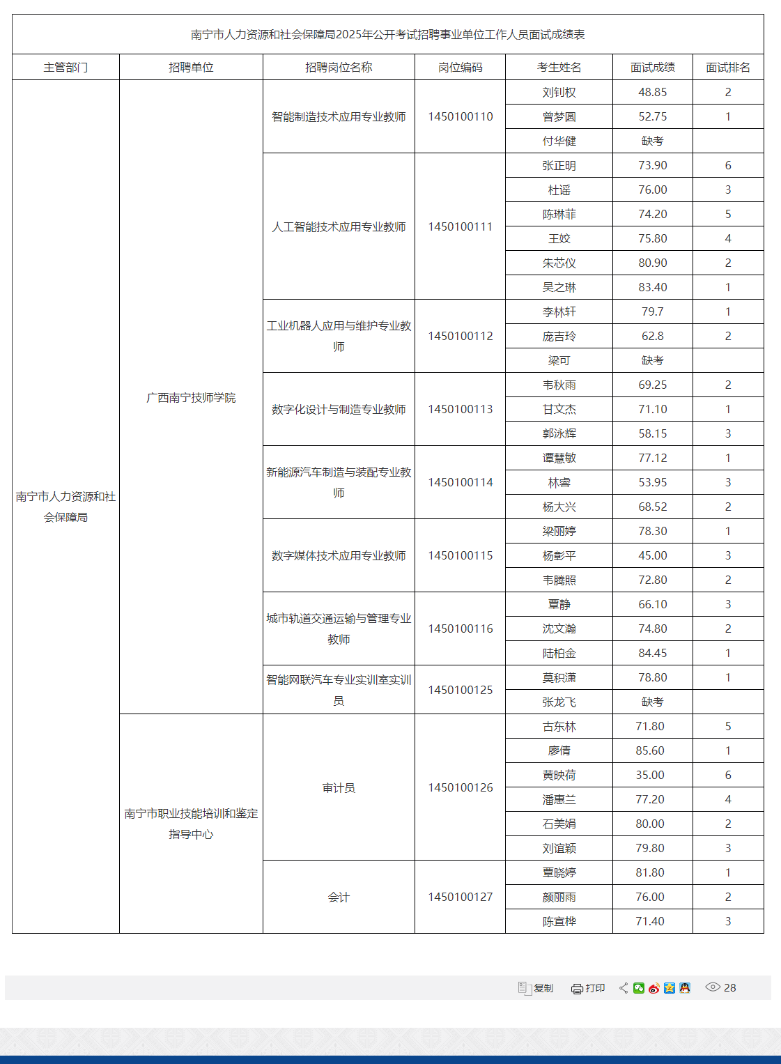原文標題:南寧市人力資源和社會保障局2025年公開考試招聘事業(yè)單位工作人員面試成績表