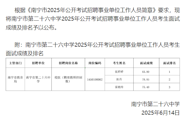 南寧市第二十六中學關(guān)于公布2025年公開考試招聘事業(yè)單位工作人員考生面試成績及排名的公告