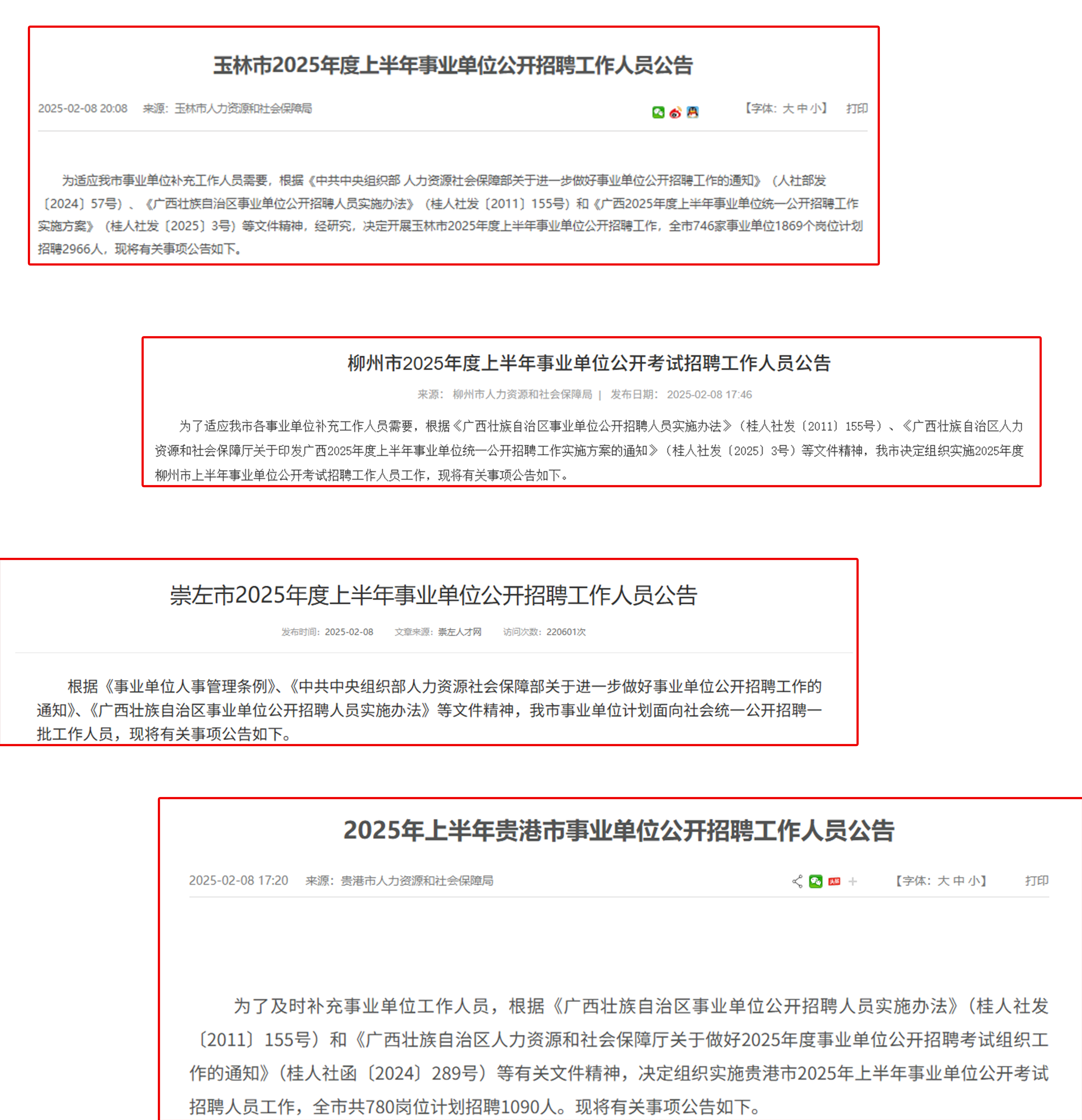 今年廣西極有可能會增加下半年的事業(yè)單位統(tǒng)招。我們在整理廣西上半年事業(yè)單位招聘公告時,發(fā)現(xiàn)一件但有意思的事,玉林、崇左、柳州、貴港這4個地市發(fā)布公告時都用了“上半年”這個字眼。要知道,這在去年是沒有的~