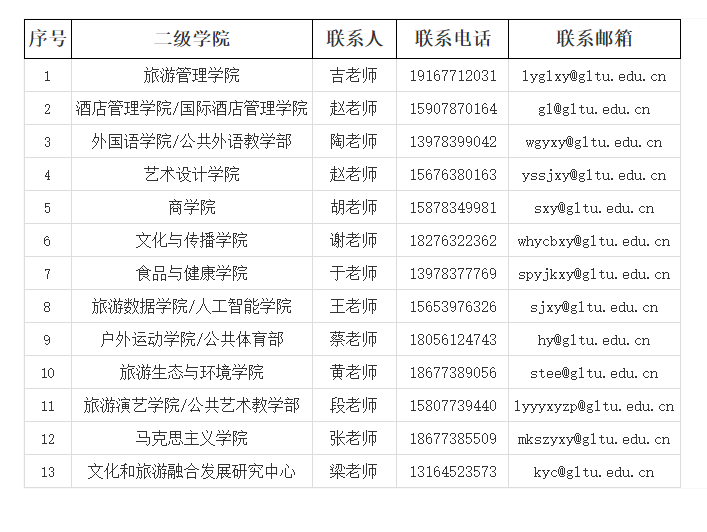 聯(lián)系地址:廣西桂林市雁山區(qū)良豐路26號(hào)桂林旅游學(xué)院人事處 郵 編:541006 聯(lián)系人:鄧?yán)蠋?/p>