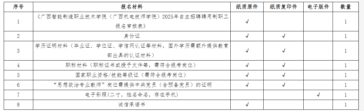 應聘者按照招聘崗位具體要求對口報名,每名應聘者限報一個崗位,采用現(xiàn)場報名遞交應聘材料的方式報名。報名人員須下載并填寫《廣西智能制造職業(yè)技術學院(廣西機電技師學院)2025年自主招聘聘用制職工報名審核表》(附表2),同時需附上相應的學歷、學位證書、身份證、職稱證書(相關崗位需要)等材料的原件與復印件(原件審核后退回,復印件不退回)