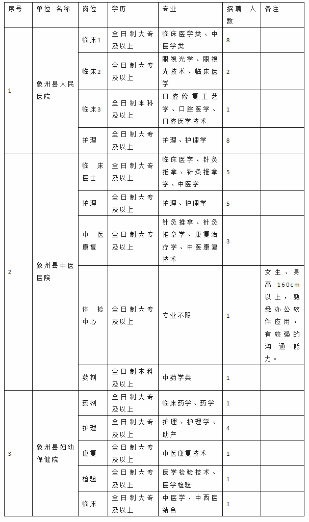 因工作需要,根據(jù)相關(guān)規(guī)定,我單位擬面向社會(huì)公開(kāi)招聘見(jiàn)習(xí)人員42名,其中象州縣人民醫(yī)院19人、象州縣中醫(yī)醫(yī)院15人、象州縣婦幼保健院8人。現(xiàn)將有關(guān)事項(xiàng)通知如下: