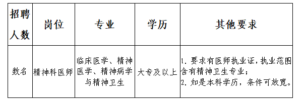 根據(jù)業(yè)務發(fā)展需要,持續(xù)加強我市心理健康和精神衛(wèi)生服務能力建設(shè),更好地滿足我市廣大人民群眾看病就醫(yī)需求,我院特面向社會公開招聘數(shù)名編制外聘用工作人員,現(xiàn)將有關(guān)事項公告如下: