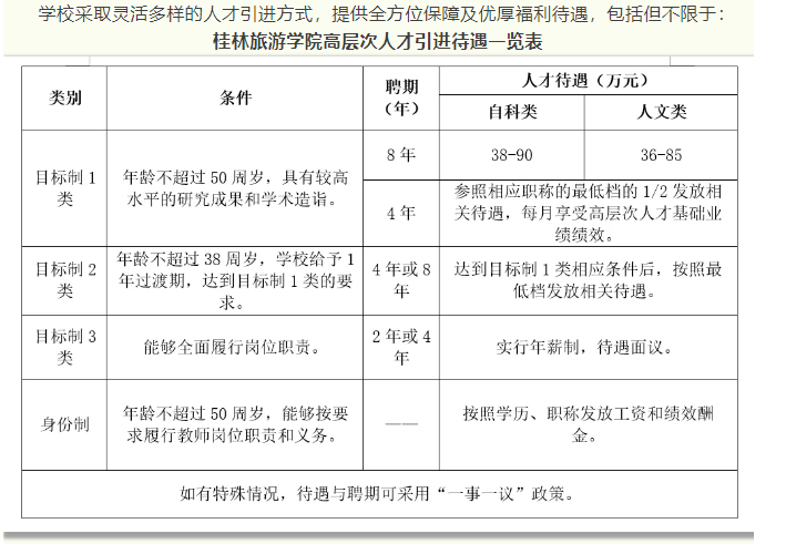 4.根據(jù)自治區(qū)政府文件要求,符合相應(yīng)條件者,學(xué)校積極配合申請廣西壯族自治區(qū)高層次人才認(rèn)定和各類人才項目,若入選可享受各類優(yōu)厚的人才待遇,詳情請登錄廣西高層次人才“一站式”服務(wù)平臺(http://www.gxrc.org/)查閱。首次來桂工作的35歲以下、具有博士學(xué)位的青年人才,可按照政策申領(lǐng)自治區(qū)青苗人才普惠性支持。如入選桂林市高層次人才,還可以享受桂林市高層次人才有關(guān)津貼、購房補貼和個稅獎勵等人才補助。詳見桂林市高層次人才一站式服務(wù)平臺(https://gcc.glrcw.com/)。