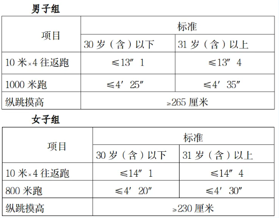 2.體測項(xiàng)目和標(biāo)準(zhǔn)。參照《關(guān)于印發(fā)公安機(jī)關(guān)錄用人民警察體能測評(píng)項(xiàng)目和標(biāo)準(zhǔn)(暫行)的通知》(人社部發(fā)〔2011〕48號(hào))的項(xiàng)目及測試規(guī)則,結(jié)合《公安民警體育鍛煉達(dá)標(biāo)手冊(cè)》成績標(biāo)準(zhǔn),本次體能測評(píng)的項(xiàng)目和標(biāo)準(zhǔn)如下:
