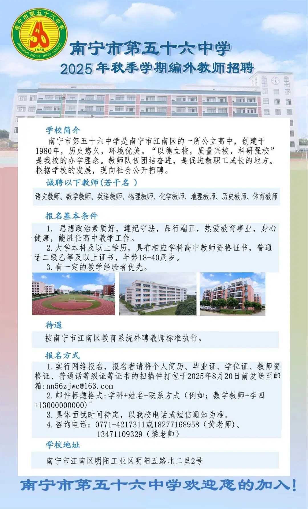 南寧市第五十六中學(xué)2025年秋季學(xué)期編外教師招聘