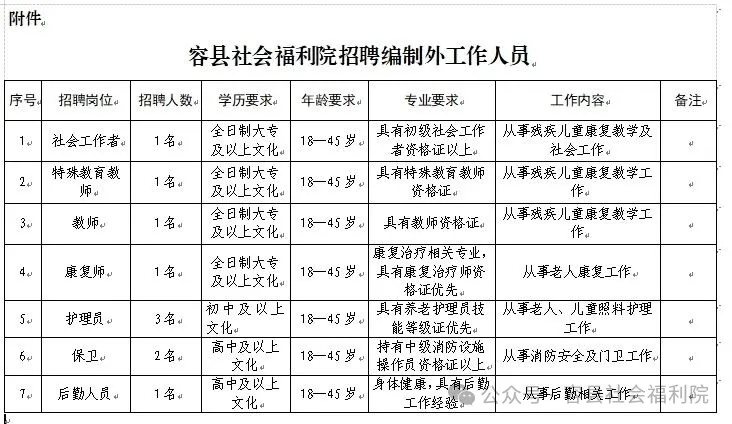 根據(jù)工作需要,容縣社會福利院面向社會公開招聘編制外工作人員若干名,現(xiàn)將有關(guān)事項公告如下: