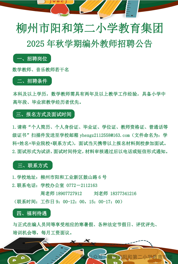 原文標(biāo)題:柳州市陽和第二小學(xué)教育集團(tuán)2025年秋學(xué)期編外教師招聘公告