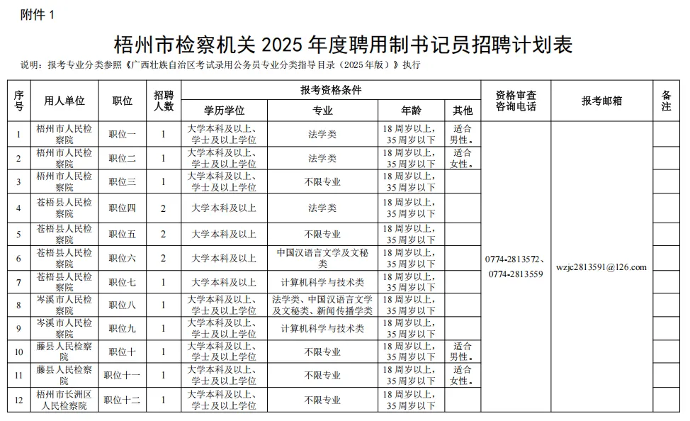 詳見《梧州市檢察機關2025年度聘用制書記員招聘計劃表》(附件1)。