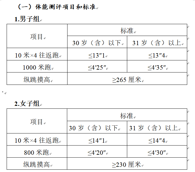 參照《關(guān)于印發(fā)<公安機(jī)關(guān)錄用人民警察體能測評(píng)項(xiàng)目和標(biāo)準(zhǔn)>的通知》(公政治〔2024〕60號(hào))執(zhí)行,每個(gè)測評(píng)項(xiàng)目分別記錄成績。其中縱跳摸高的測評(píng)次數(shù)不超過3次,10米×4往返跑測評(píng)次數(shù)不超過2次,男子1000米跑、女子800米跑測評(píng)次數(shù)均為1次。